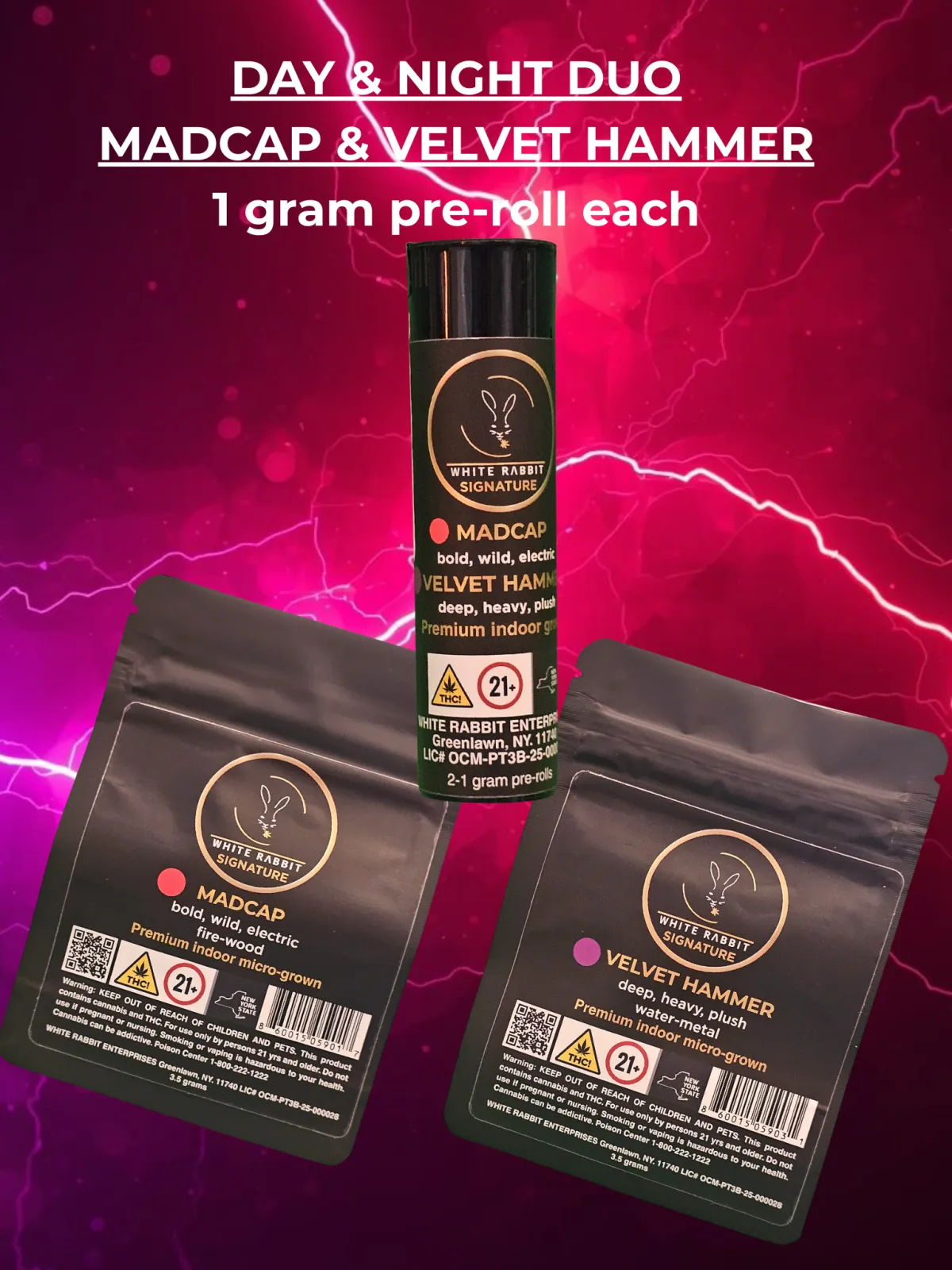 Day & Night Duo: 2-1 gram pre rolls of Madcap and Velvet Hammer